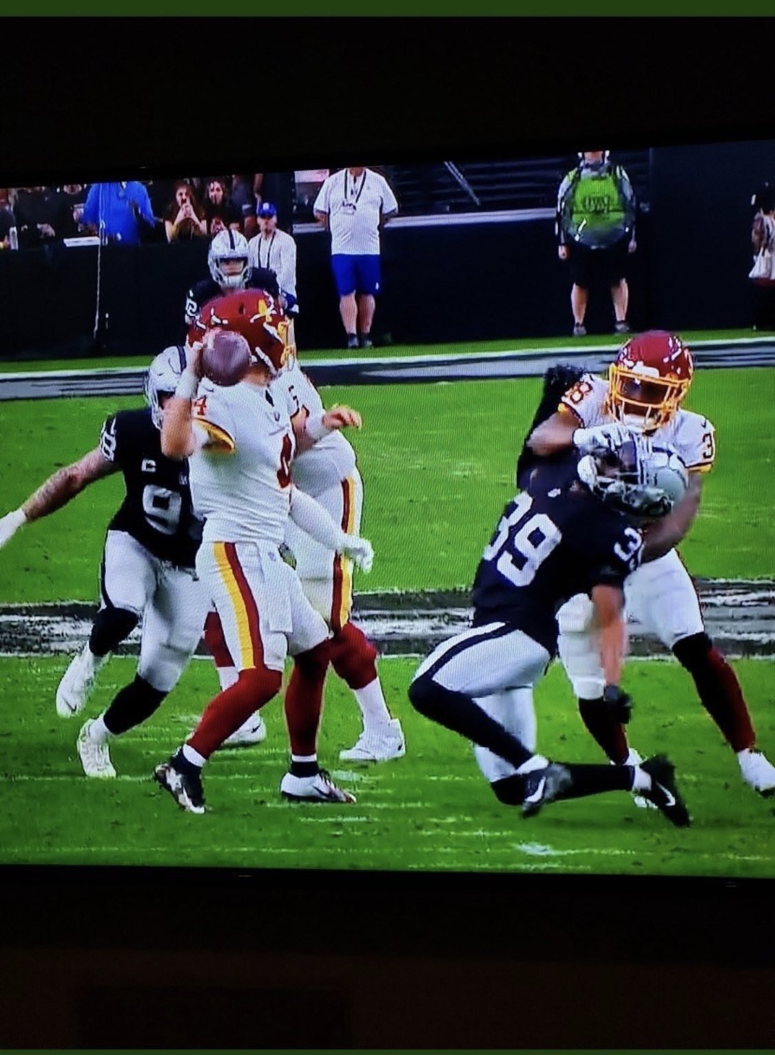 But if you think the reason the Raiders couldn’t take down Washington was the referees, you’re sadly mistaken. Go back to that questionable no-call at the end. Despite the jersey pull, Zay Jones had every chance to catch that ball — it hit him in the fucking head for god’s sake. If Jones’ hands were made out of anything but concrete, he might’ve come down with that (or any other pass Jones had. Go back to Trevon Moehrig dropping a game-sealing INT. Go back to those calls against the Raiders and see how Las Vegas was still in the lead late, when the defense decided to play two-hand touch and let Washington drive down the field lickedy split in crunch time. Go back to how, despite the penalties and last-minute choking, the defense still held Washington to under 20 points and gave the offense plenty of opportunities to put up points. Go back to Derek Carr missing an open Brian Edwards in the end zone and forcing the Raiders to settle for a FG. Go back to the missed two-point conversion that, had it been successful, would’ve meant Washington could only tie the game with a FG. Hell, go back to the first play of the last drive where, needing just a FG, the Raiders went for it all and lost valuable time in the process.
