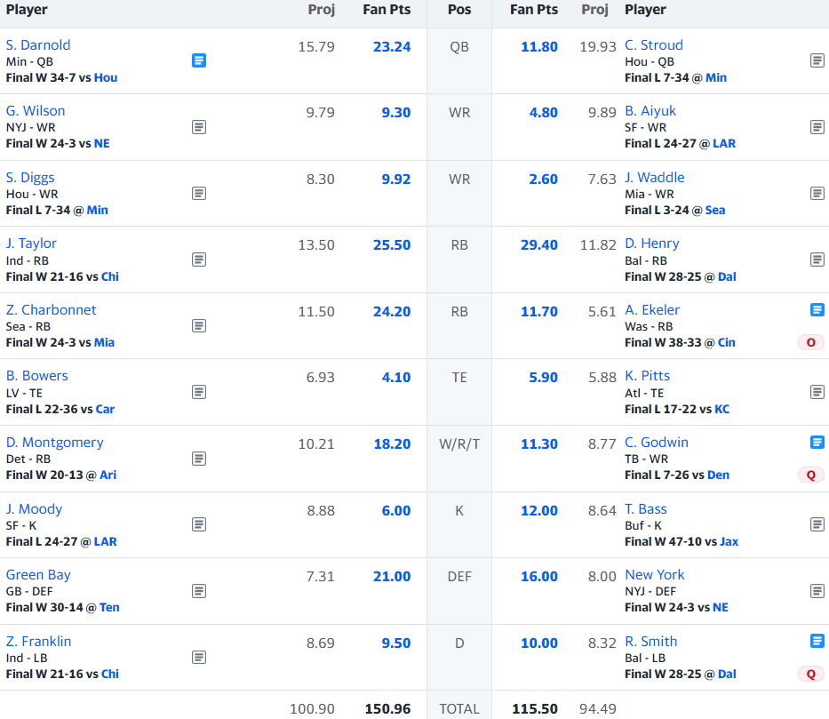 BEST: Maybe we should’ve seen this coming, given that Nick scored the second-most points in Week 1. But not only is a 150-burger surprising normally, it’s even more so due to the makeup of Nick’s lineup (especially post-Tua Tagovailoa injury). Sam Darnold, Zach Charbonnet, David Montgomery, and the Packers defense (post-Jordan Love injury). What a roster, indeed.
