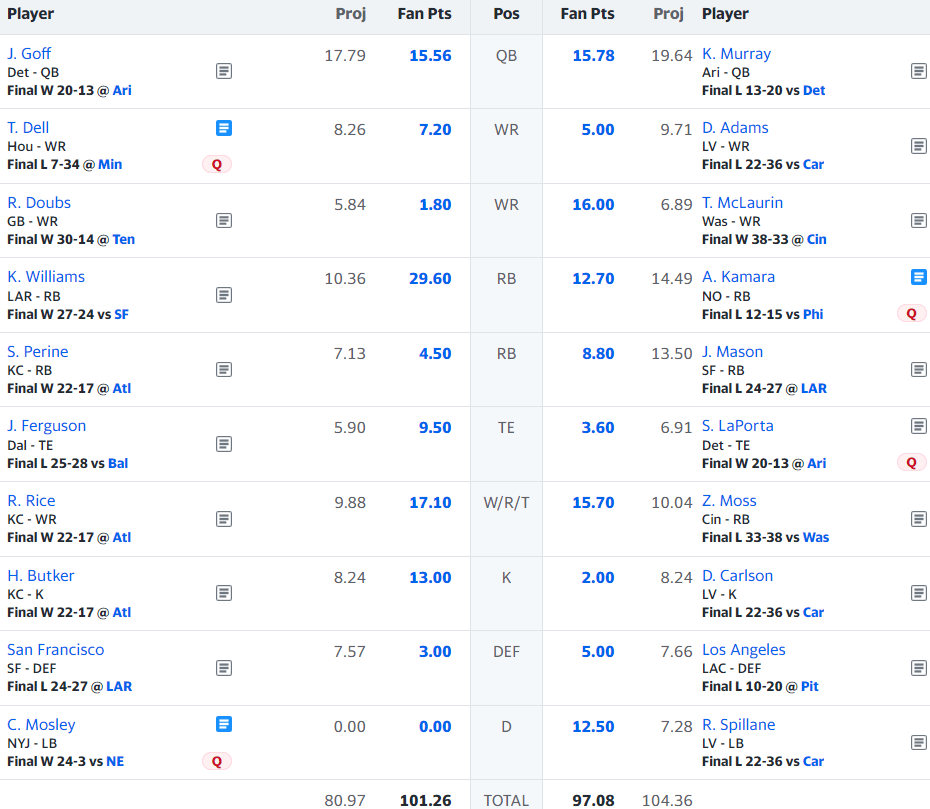 (Roseanne Roseannadanna voice) Jimmy from Sacramento writes in, says, “Dear Roseanna Roseannadanna, Hog Wild just lost to Footballdamus and it’s not right! Riaz’s team sucks and I’ve scored the third-most points so far, yet he beat me! What gives?” You know, this reminds me of the time my father taught me how to play fantasy football, and we started watching TV and I saw all of the dirt and sweat and blood on the players’ jerseys — know how some guys sweat so much they soak through the back and other guys slid on the midfield logo so they look like an art pastel and other guys look so clean like they barely touched the field — those are the guys who would love to try to tackle Roseanne Roseannadanna for loss of down if you know what I mean. Anyway, sometimes your opponent just has guys like Kyren Williams (29 points) who go off, while you leave 50 points from Jayden Daniels and Chubba Hubbard on the bench! That last one was some pro-Raiders bias — Roseanne Roseannadanna can tell! Anyway, back to you, Jane.