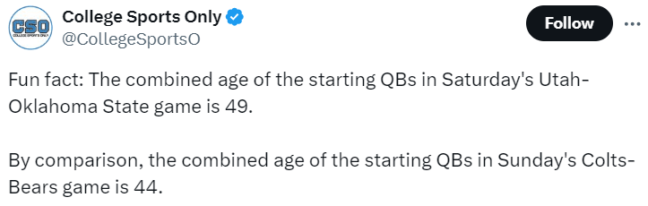 This is, to put it mildly, fucking nuts. It’d be one thing if both pairs were about the same age, but separated by just a few months. But we’re talking about a pair of college kids being five years older than a pair of pros. I’m not sure how much longer CFB will be impacted by the extra year of eligibility from the pandemic. But between that surely expiring in the near future and the overall drop in QBs leaving early to go pro (which I’m predicting because most of them have sucked recently), this might be the last time we see something like this. Also, shoutout to the last two college QBs to be born in the 90’s. We’re getting old, y’all.