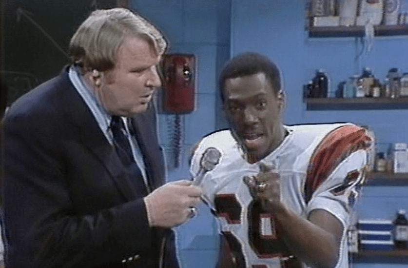 As you remember from Trivia Night, Carl Weathers is a former LB for the Oakland Raiders. But that’s not why he’s famous — after retiring, he became an incredibly successful actor, best known as Apollo Creed in the Rocky film franchise. While Weathers did well (as expected) when he hosted the tenth episode of SNL‘s 13th season, I want to focus on hosts who were primarily football players and chosen for their athletic fame. After all, Weathers’ hosting gig was part of the promo tour for Action Jackson (and came on the heels of his famous role in Predator).