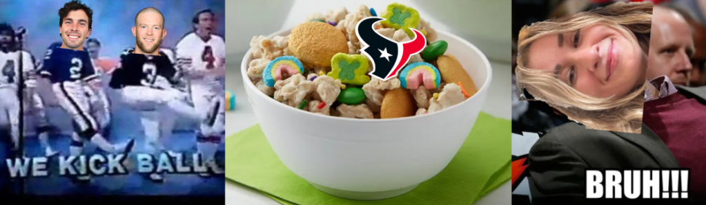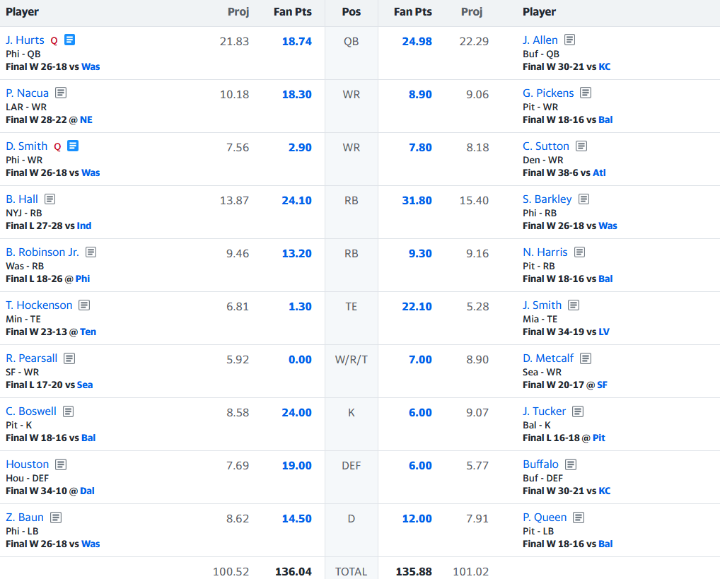 Holy shit lol what the fuck did we just see? This might’ve been the matchup of the year, with plenty of twists and turns and arguably the comeback of the year. It also featured two notable lineup exclusions, with both Maybe Next Year (Jared Goff – 34 points) and Queen’s Gambit (Jerry Jeudy – 20 points) leaving even more points on the board. But those were the only weapons who didn’t get to shine, as Kyle and Aly both emptied their barrels. It didn’t seem that this would be too competitive, with Saquon Barkley (31 points) getting much more for Aly than Jalen Hurts and DeVonta Smith did for Kyle combined. But then the rest of Kyle’s lineup (outside of Ricky Pearsall and T.J. Hockenson) started to go off, with Breece Hall (24 points), Chris Boswell (24 points), and Puca Nacua (18 points) leading the pack. However, a pair of late-game TDs from Josh Allen (24 points) and Jonnu Smith (22 points) gave Aly a seemingly insurmountable lead of just under 19 points going into Monday. The Texans defense got Kyle exactly 19 points. In-fucking-credible.