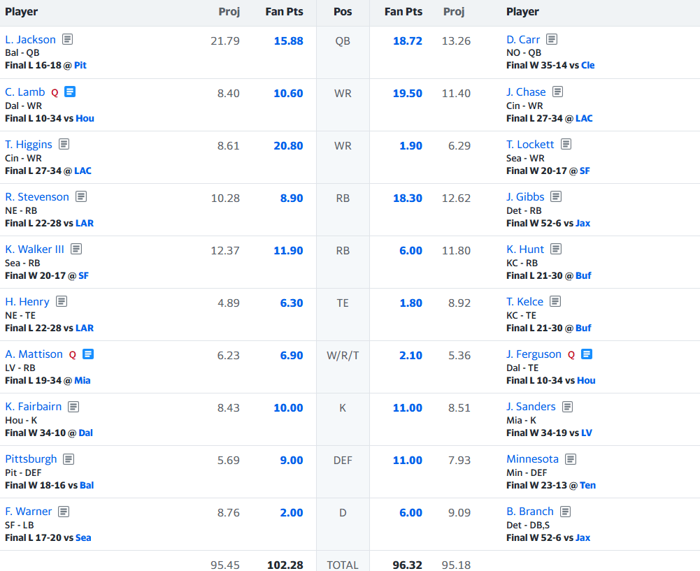 The third of three matchups to be decided by fewer than ten points this past week, this one was somehow the most normal, despite everything I’m about to say. Derek Carr (Well Damn) out-performed Lamar Jackson (The Antarcticans). Tee Higgins outscored Ja’Marr Chase despite the latter scoring one more TD than the former. Hunter Henry outscored Travis Kelce, Tyler Lockett, and Jake Ferguson (who to be fair got concussed) combined. Fred Warner was my lowest scorer and I decided at the last minute to replace Jameson Williams (18 points) with Alexander Mattison (much less than that). Is this the kind of thing that’s supposed to happen when the 1st and 2nd place teams face off? Regardless, it came down to Monday, with my chances of making up a notable deficit increased by Chriss being hampered with Ferguson’s injury. That allowed CeeDee Lamb and Ka’imi Fairbairn to do just enough to each finish in double digits, good enough to get me a win that I both should’ve gotten easier yet at the end of the day was lucky to earn.