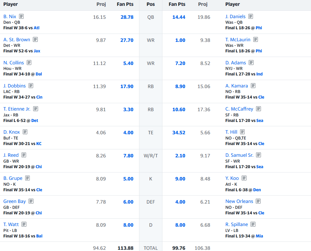 When I saw that Taysom Hill of all people had a career day, I, like many of you, looked up who (if anyone) had him rostered. When I saw he was on Wild Hogs, I thought that guaranteed a win. I then saw the score and thought, “how is Jimmy not winning?” The answer, as it was when De’Aaron Fox dropped 60 points in a recent Sacramento Kings loss, was that no one else on the team did anything. In fact, only Jayden Daniels and Christian McCaffrey even surpassed the double-digit mark. Terry McLaurin, Deebo Samuel, and the Saints defense were particularly disappointing, preventing Jimmy from even cracking the triple-digit mark. Honestly, as a whole, Velvet Thunder’s roster didn’t do much better, with the same amount of double-digit performers as their opponent. But while none of Emilio’s players could match Hill, two of them — Bo Nix (28 points) and Amon-Ra St. Brown (27 points) — got close. They and J.K. Dobbins (17 points) did enough to make Hill’s exceptional day irrelevant and give Emilio a surprisingly decisive win.
