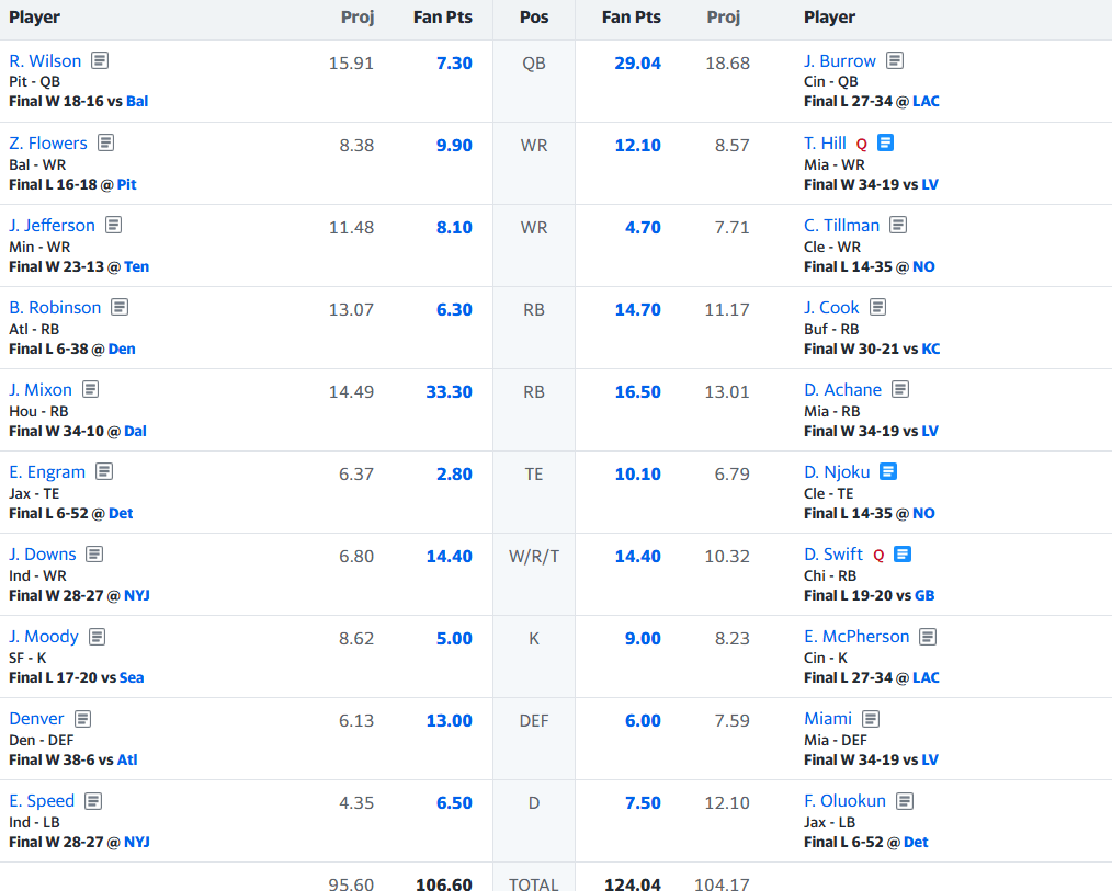 Do my eyes deceive me — is Bone 2 Bone actually winning games? From multiple games back and seemingly secured into the last place punishment to breathing down the necks of several 30-somethings who thought they didn’t have to run a beer mile, Dad has suddenly made the race to not finish last an exciting one. Dad may not have gotten the services of the top scorer in this matchup — Channel 4 News Team got that luxury with Joe Mixon (33 points) — but he did get six of the next eight, allowing him to easily withstand Mixon’s late rush on Monday. Joe Burrow (29 points) actually got to be part of a winning team (more on that later), while De’Von Achane (16 points), D’Andre Swift (14 points), and James Cook (14 points) provided a potent ground attack. Only John Downs (14 points) and the Broncos defense (13 points) could provide Arik with other firepower, with the likes of Justin Jefferson, Bijan Robinson, and Jake Moody having subpar performances. With Dad winning two out of his last three, 11th place had better watch out.