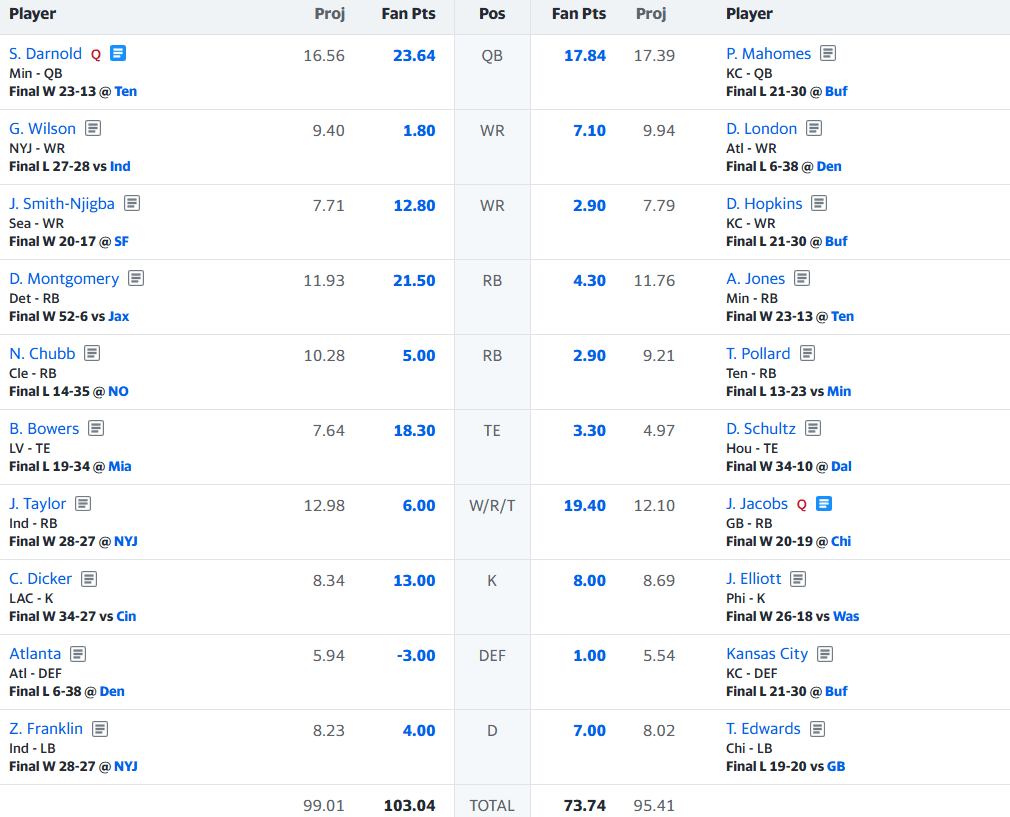 BAD: Arik made two decisions that had a huge impact on his lineup. First, he added the Broncos defense in exchange Diontae Johnson, with Denver getting him 13 points. That was good. But then he added and started Russell Wilson, who failed to crack double-digits. Jordan Love, meanwhile, was left on the bench, his 21 points gone to waste. That was not good — bad, even.