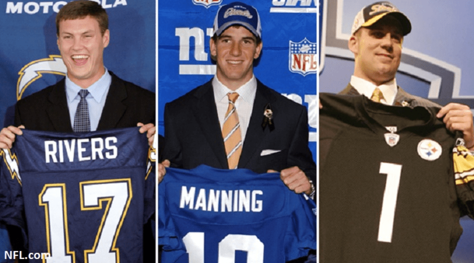 Chad Pennington (2000-18), Michael Vick (2001-1), David Carr (2002-1), Joey Harrington (2002-3), Patrick Ramsey (2002-32), Carson Palmer (2003-1), Byron Leftwich (2003-7), Kyle Boller (2003-19), Rex Grossman (2003-22), Eli Manning (2004-1), Philip Rivers (2004-4), Ben Roethlisberger (2004-11), J.P. Losman (2004-22)
