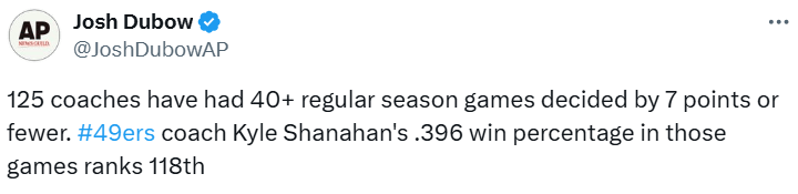 Is Kyle Shanahan the most anti-clutch coach in NFL history? That may seem like a clickbait headline, but it’s beginning to be more of a reality. His reputation wasn’t good when the season began, having been the face of 28-3 and losing two other Super Bowls (this time as head coach) despite having a lead late in the 4th quarter. Then the season began and things haven’t exactly improved. Of course, injuries to key players have hampered the 49ers’ potential. But few teams are as stacked as San Francisco, which should have the talent to at least take care of the bad to average teams in the league, especially with the likes of Brock Purdy, Deebo Samuel, and the seemingly never-ending plethora of RBs they have. Hell, they’re certainly talented enough to have a lead in the 4th quarter against every team in their division. But they’re also anti-clutch enough to blow all of those leads, against teams that on paper are worse. Plus, it’s not like the 49ers are the only team with injuries. The Minnesota Vikings beat San Francisco (and are doing much better overall) despite losing their starting QB in the preseason and being forced to start Sam Darnold (the ex-49ers backup, ironically). Hell, the Tampa Bay Buccaneers nearly pulled off a win in Santa Clara despite being without both Mike Evans and Chris Godwin.
