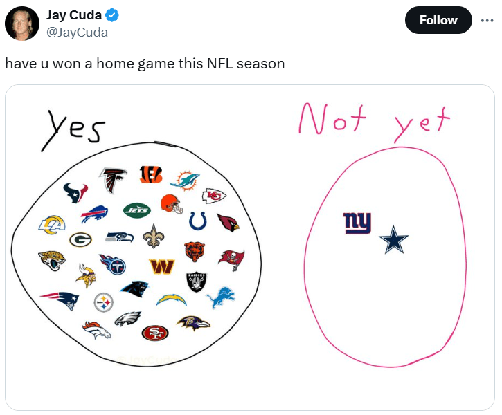 The Cowboys aren’t just bad, they’re historically bad, especially at home. In fact, they have not won a home game since December 30, AKA the infamous “ineligible receiver” game against the Detroit Lions. Including the Wild Card ass-kicking at the hands of the Green Bay Packers and a preseason loss to the Chargers, Dallas has played seven games at home in the calendar year of 2024. Every one of them has been a loss. Here’s a list of those who have won a game/competition at AT&T Stadium in 2024: the Packers, Chargers, Saints, Ravens, Lions, Eagles, Texans, Texas A&M, the U.S. & Canadian men’s national soccer teams, Sage Steele Kimzey & Cassio Dias (PBR), the Eastern Eagles (MLW), and Jake Paul. Given that the Cowboys aren’t gonna make the playoffs, they have four more chances to avoid a winless 2024 at home. By far their easiest remaining home opponent is the New York Giants, who Dallas not only beat earlier this year, but who just made their $160M QB their QB4. If they can’t beat Tommy Cutlets on Thanksgiving, there’s no hope.