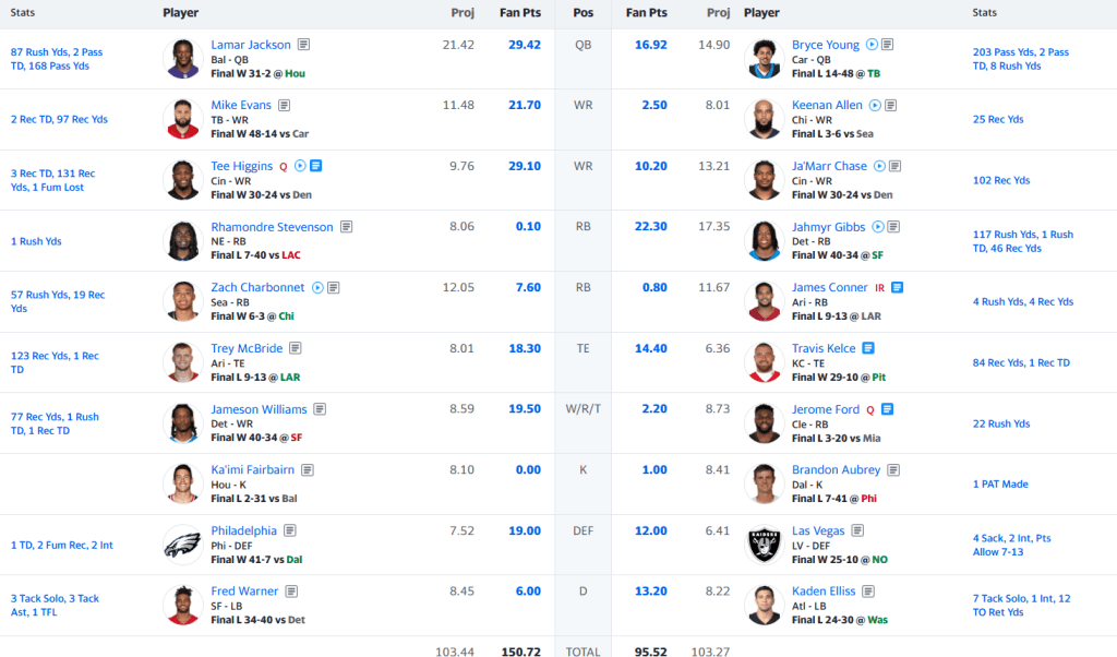 I had to defend myself against a five vs. two situation on Sunday, hoping I could maintain my lead. Bryce Young (16 points), Kaden Elliss (13 points), and the Raiders defense (12 points) did well for Chriss, but poor days from Jerome Ford and Brandon Aubrey prevented a true surge. The latter was partially due to the Eagles defense (19 points), which I had picked up in place of the Steelers (who finished in the negative). Throw in my most consistent non-Lamar Jackson player — Mike Evans (21 points) — having one more heroic effort, and I had essentially kept my lead entirely entact. But even up by 52 points going into Monday, my paranoid ass was fearful of Jahmyr Gibbs pulling an Alvin Kamara and dropping enough points to make the comeback. Fortunately, while Gibbs (22 points) was strong, it was far from enough to close the gap. Throw in two TDs from Jameson Williams (19 points) and a decent day from Fred Warner and I actually increased the margin of victory. All of that worry, having since given way to much joy.
