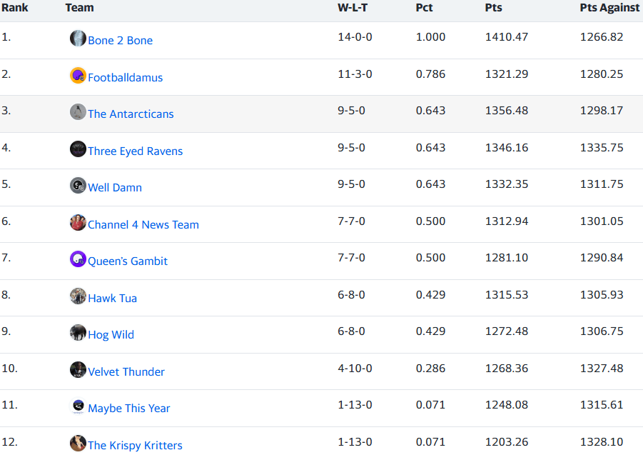 WORST: This one is actually a debate. Should it go to the top team in the league who had a good quarter-final, but lost to someone with an even better week? Should it go to the semi-finalist who only lost to the highest scorer? Should it go to either of the two members of the potential Epic Bowl matchup had a certain QB not gotten hurt? Aly, Jimmy, Kyle, Chriss — this one’s for you.