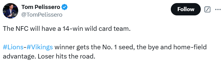14 wins for a Wild Card berth. That is insane. At the very least the first playoff game should be against whoever wins the NFC South, so it’s like a bye. Then again, Baker Mayfield has been slingin’ it and the Tampa Bay Buccaneers are the only team to beat both the Loins and Philadelphia Eagles this season.