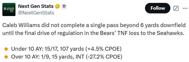 Perhaps no championship has done more heavy lifting than Super Bowl XX. No wonder why Bears fans revere that 1985 team so much — where the hell would Chicago be without it? Let’s not forget that at one point this season, the Bears were 4-2 and were about to become 5-2 with a last-minute win over the Washington Commanders. Then a Hail Mary changed that win to a loss, now one of ten in a row for Chicago. Caleb Williams has shown signs of talent despite being part of such a mediocre franchise, but his struggles have also been apparent. Even so, Williams did etch himself in Bears history, having tied the all-time record for most seasons starting 16 games at QB… with one. Seriously. Even more incredible: Williams’ season is Top 5 in Bears history when it comes to passing yards. Chicago: where “QB” doesn’t have success unless it’s reversed and has an extra “B” in front of it.