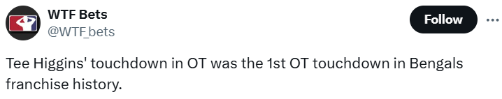 The Bengals have been around since 1968, and this is the first time they’ve scored an OT TD. Insane. What’s even more insane is Joe Burrow’s aforementioned MVP-worthy season probably going to waste. Burrow and his WRs are dragging Cincinnati towards an unbelievable playoff berth, which will probably end when the Denver Broncos take advantage of Pat Mahomes resting this weekend. Given Tee Higgins’ contract status, this might be the last time this Bengals offense gets to show its thing. With the way Burrow is playing, that’s a damn shame. Still, Tee Higgins deserves to get paid, though I might be biased.
