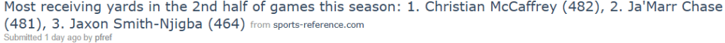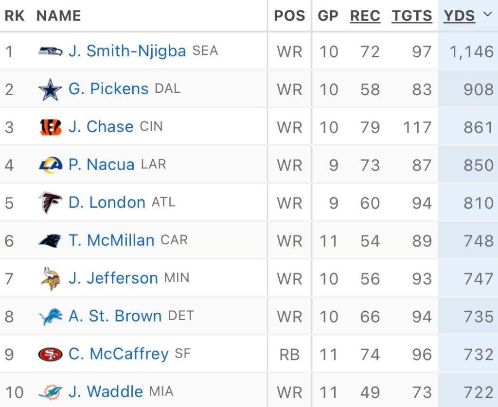 Christian McCaffrey’s receiving ability needs to be studied in a lab. Also, good on Ja’Marr Chase for getting within spitting distance of the top spot, unlike with the total yards race.