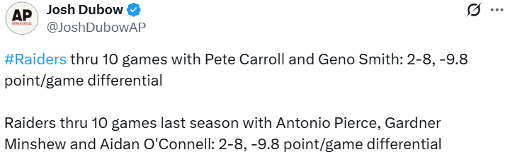 Against the Dallas Cowboys — owners of arguably the worst non-Cincinnati Bengals defense in the NFL — the Las Vegas Raiders put up a mere 236 yards of total offense, found the endzone just once (and not the time the defense forced a fumble in the red zone), and tallied just 16 points. Dallas had yet to hold an opponent under 20 points all season. Geno Smith threw for just 209 yards, 1 TD, and 1 INT and was sacked four times. In spite of the lack of success in the air, the Raiders only called eight running plays and finished with 27 rushing yards. 14 of those yards came on scrambles by Smith, while Ashton Jeanty finished with one more yard (seven) than carries (six). The Raiders defense, on the other hand, had two good stops on Cowboys drives (one of them when neither CeeDee Lamb nor George Pickens took the field) and forced a turnover before promptly rolling over and dying. With his four scoring tosses, Dak Prescott surpassed Tony Romo for most games with three passing TDs in franchise history. Those scores came despite throwing two fewer passes and just 58 more yards than Smith.