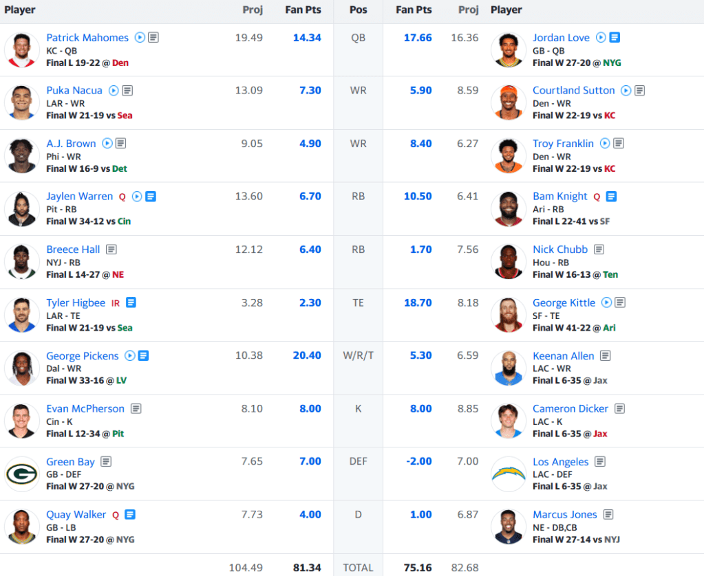 Holy shit that should not have been that close. WHY WAS THAT SO CLOSE?!? On paper, managing to get a win over a team on a three-game winning streak shouldn’t be cause for alarm. But when that opponent barely cracked 75 points, alarm bells are going off in my head. Credit to Footballdamus — three wins is a hell of a lot more than zero, and Riaz has suddenly made the race to not finish in last place actually competitive. All they can do is their best and Riaz has taken advantage of his opponents failing to reach expectations. Certainly, the Antarcticans failed to reach their expectations this past weekend. Pat Mahomes failed to unlock the Broncos defense, I got shell shocked by Sam LaPorta’s sudden placement on the IR, and A.J. Brown continues to piss me off to no end. But then George Pickens (20 points) managed to save the day on Monday night and made the Raiders’ performance (more on that later) slightly bearable. I’ve been decreasing my point output every week for the past month. That’s not a good sign.
