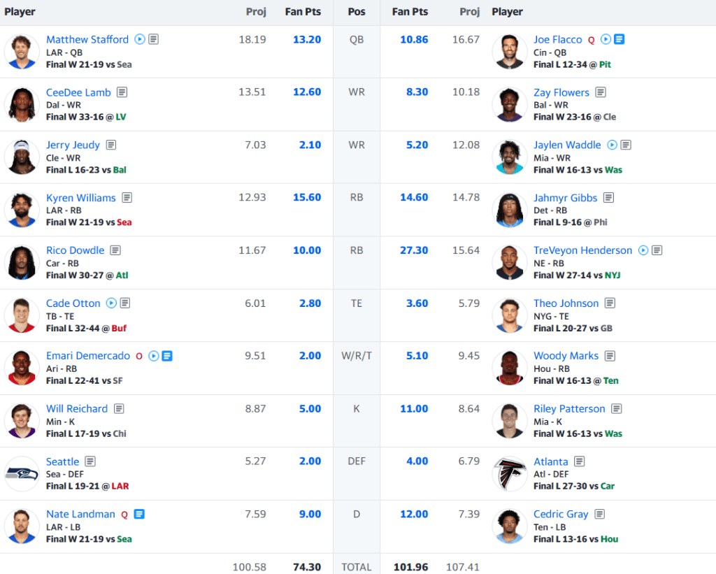 Another sign of a true contender: being able to win when your stars play like crap. For example, Lamar Jackson and Davante Adams didn’t have much for Spider 2 Y Banana, while Saquon Barkley and Javonte Williams were average. But Jimmy not only still came out on top, but put up a respectable scoring total. Wil Lutz (18 points), Trey McBride (17 points), and Nico Collins (15 points) were all key to the victory. It also helped that the Three Eyed Ravens were missing Jonathan Taylor, who’s pretty much the reason Ewing is among the scoring leaders so far this season. That being said, Ewing’s lineup had a chance to counter and even get the win. But only Mark Andrews (12 points) put up any kind of effort to do so. Jalen Hurts was average and the rest of the lineup ranged from poor to mediocre. In the end, Ewing is once again snakebitten, but still well within range of making the playoffs. Jimmy once again reasserts himself as a top contender, which given how close the standings are at this point could be key for the playoff push.