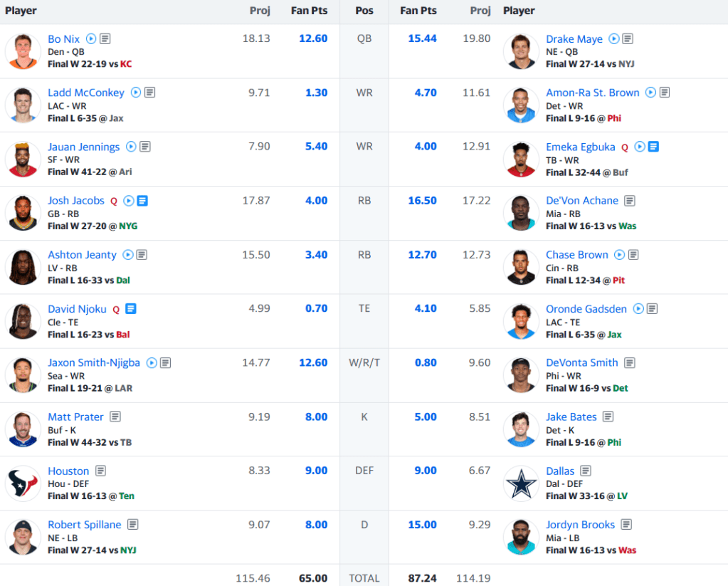 Late lead changes, exceptional performances, major mistakes and letdowns, and a Monday night decider — the matchup between the Krispy Kritters and Bone 2 Bone had it all! That includes a stellar display on the ground, with Christian McCaffrey (30 points), Bijan Robinson (26 points), Travis Etienne (19 points), and Kenneth Walker (17 points) each doing work. Dad also got a massive boost from the Steelers defense (21 points) to give him an early lead. However, he couldn’t build upon it for several reasons, including a poor day from Kyle Pitts. But in the end it was the combo of J.J. McCarthy and Justin Jefferson that completely whiffed, allowing Richard to mount a late comeback thanks to Jameson Williams (15 points) on Sunday night and his real life QB Dak Prescott (24 points) the following night. Yet, it shouldn’t have even been a contest — Dad has 62 combined points from Sean Tucker and Tetairoa McMillan wasted on his bench. While hindsight is 20/20, it has to hurt for Dad to see how easily he could’ve won this contest.