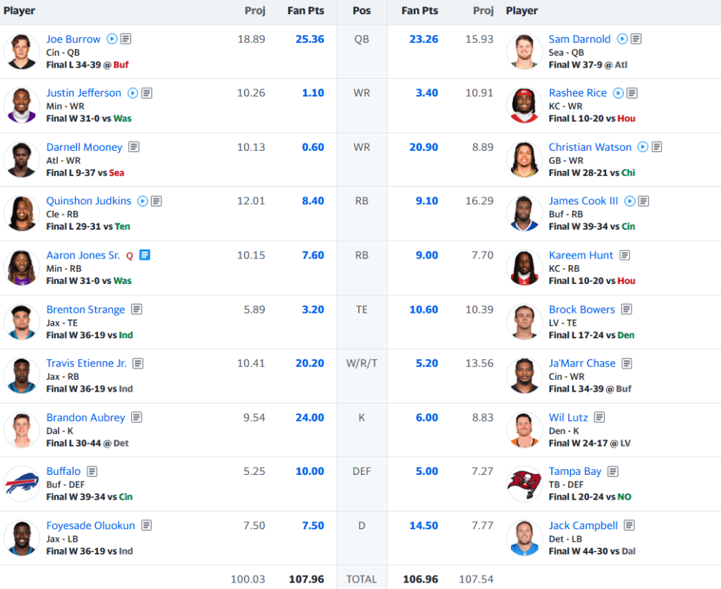 It’s a testament to how insane this past weekend was that the closest matchup wasn’t even impacted by the shitshow on Monday night. Though Bone 2 Bone was seemingly locked into the playoffs, Third Time’s A Charm certainly wasn’t. Dad jumped out to an early lead thanks to Brandon Aubrey (24 points), but failed to build upon it, with the likes of Justin Jefferson, Brenton Strange, and Darnell Mooney having terrible days. That allowed Chriss (who had Jack Campbell [14 points] to help him out) to climb back into the matchup, with Sam Darnold (23 points) and Christian Watson (20 points). Still, Joe Burrow (25 points) and Travis Etienne (20 points) kept Dad in the lead until Sunday night. While the likes of Ja’Marr Chase should’ve put Chriss in a better position, he still had Kareem Hunt and Rashee Rice to make up about 13 points. But then Texans-Chiefs turned into a defensive battle, leaving the result up to the final drive of the game. Chriss ended up just one point behind Dad, putting him at risk of missing the playoffs entirely.