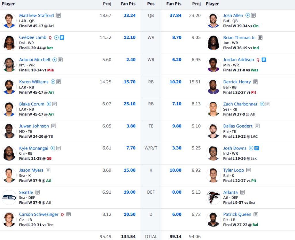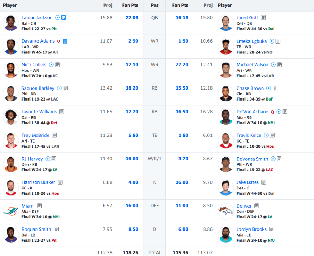 While Spider 2 Y Banana had already clinched a playoff spot and Don’t Draft and Drive had tallied enough points to already have one foot in the door, the outcome of this matchup was set to have a major impact on the final standings either way. Both Jimmy and Kyle’s lineups decided to go completely hit or miss in this crucial clash, with the majority being hits. Those include Lamar Jackson (22 points), Michael Wilson (27 points), Chase Brown (15 points), and Nico Collins (12 points), not to mention Jared Goff, RJ Harvey, De’Von Achane, Jake Bates, and the Broncos defense — all of which scored 16 points each. As Sunday turned to Monday, Kyle stood with a healthy lead over Jimmy, with both having a member of the Eagles going to end the week. Unfortunately for Kyle, DeVonta Smith was a victim of Jalen Hurts’ war crime of a game. Also unfortunately for Kyle, Jimmy had Saquon Barkley (18 points), who did just well enough to squeak out the win and clinch the second seed in the playoffs and drop Kyle in the standings.
