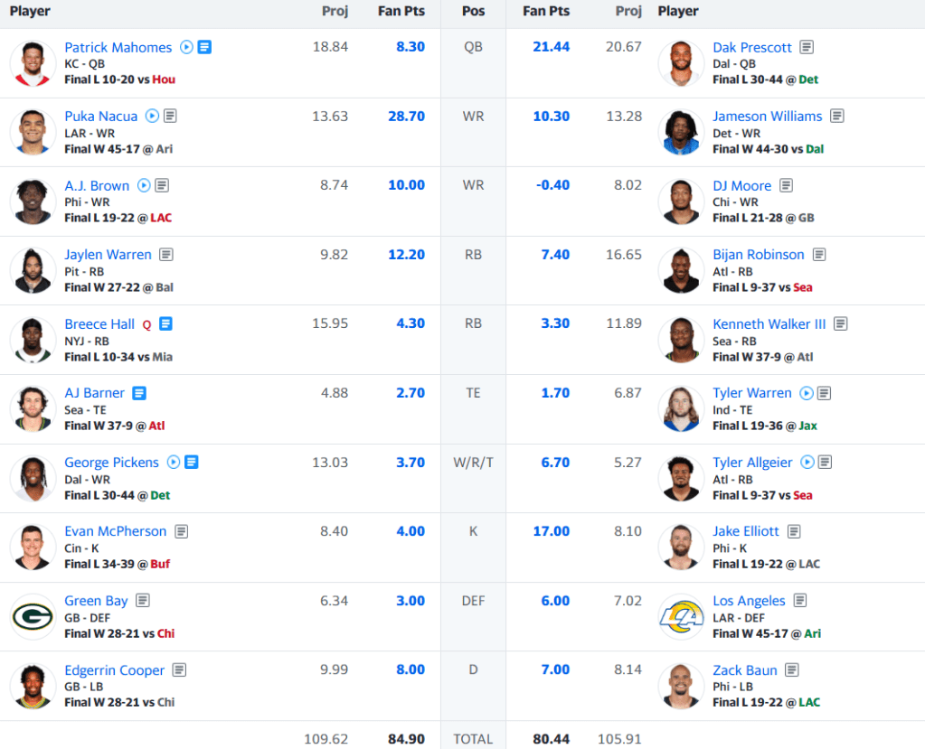 So after back-to-back weeks of being the week’s top scorer, the Antarcticans choose the week before the playoffs to come back to earth with a heavy thud. Three players — THREE — in my lineup managed to crack double-digits. Yet somehow, I managed to win. Well, not somehow — I know exactly how I won. First, Puka Nacua (28 points) put in some friggin work. Then, the Krispy Kritters somehow crapped the bed worse than me. It didn’t seem like it would start that way, with Dak Prescott (21 points) and Jameson Williams getting Richard off to a good start. But then the rest of his lineup went to work, with his team and mine battling to see who could whiff at the most pitches. At the end of Sunday, I had what seemed to be a solid lead, despite Pat Mahomes’ best efforts. A.J. Brown had seemingly done enough to counteract Jake Elliott (17 points), but then Eagles-Chargers went into OT. As I braced myself for a final FG to sink me for good, Hurts threw another INT and I managed to escape, while Richard’s fate suddenly became much murkier.