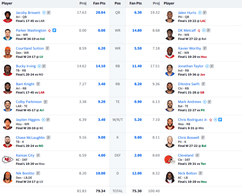 WORST: Oh, where do we begin? Ewing putting Tony Pollard (28 points) in over Chris Rodriguez would’ve kept Riaz in last place. Chriss swapping in David Montgomery or Omarion Hampton over Kareem Hunt would’ve had him in the playoffs and sent Nick home. Kyle putting Amon-Ra St. Brown in over DeVonta Smith would’ve given him the No. 2 seed. There’s a lot to go on here.