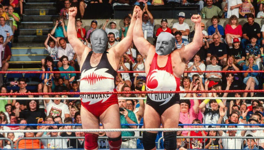 As “Blue Moon of Kentucky” blasts over the venue, Zachary Taylor strides down the ramp and jumps into the ring. Taylor takes advantage of the prior scuffle and sends Washington and Bush into opposite corners. He alternates back and forth, hitting one with a splash before running to the other side and hitting the other. While many expect Taylor to pick one side of the ring, he instead keeps up this vague strategy until the buzzer sounds again and the saxophone riff of “Careless Whisper” plays across the venue. Bill Clinton enters to a chorus of boos that probably would’ve been cheers a year or so ago. As the crowd breaks into chants of “EPSTEIN!,” Clinton ducks a lariat attempt by Taylor, runs the ropes, and hits Taylor with a spear. As Clinton tries (and fails) to appease to the crowd, Taylor struggles to get to his feet, clutching his stomach. Washington and Bush, having recovered enough, decide to compromise and hit Taylor with a double clothesline, sending him over the ropes for the first elimination of the match.