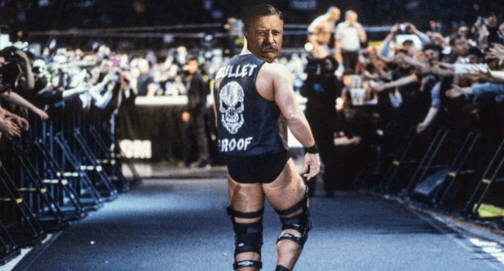 As “Ruff Ryders’ Anthem” by DMX blares throughout the venue, Taft and Cleveland suddenly freeze, their eyes bulging with fear at the sight before them. Theodore Roosevelt walks slowly to the ring, eyeing his first two victims as the crowd chants “TEDDY!” at him. As he steps through the ropes, Roosevelt is met by Taft and Cleveland in the middle of the ring, his gaze at the two hosses unflinching. Taft and Cleveland attempt a double clothesline, only for Roosevelt to duck underneath, bounce off the ropes, then hit both of them with a clothesline of his own. The Presidential Disasters crash to the ground, shocked that someone managed to put both of them down. They both get back up and go after Roosevelt, who manages to fend off both of their strikes. But the two-on-one advantage eventually turns the tide, with Taft and Cleveland pushing Roosevelt to the ropes. They both go to tip over Roosevelt, who manages to use his legs to hang onto his attackers. Just as they slightly loosen their grip, Roosevelt suddenly pushes himself off the ropes and springs behind Taft and Cleveland. He then grabs one of each of their legs and, using immense strength, hoists both Taft and Cleveland into the air and tosses them both over the ropes. The Presidential Disasters crash to the floor with a massive thud, looking stunned as Roosevelt stands on the ropes arms raised as the crowd roars in excitement.