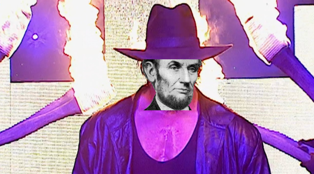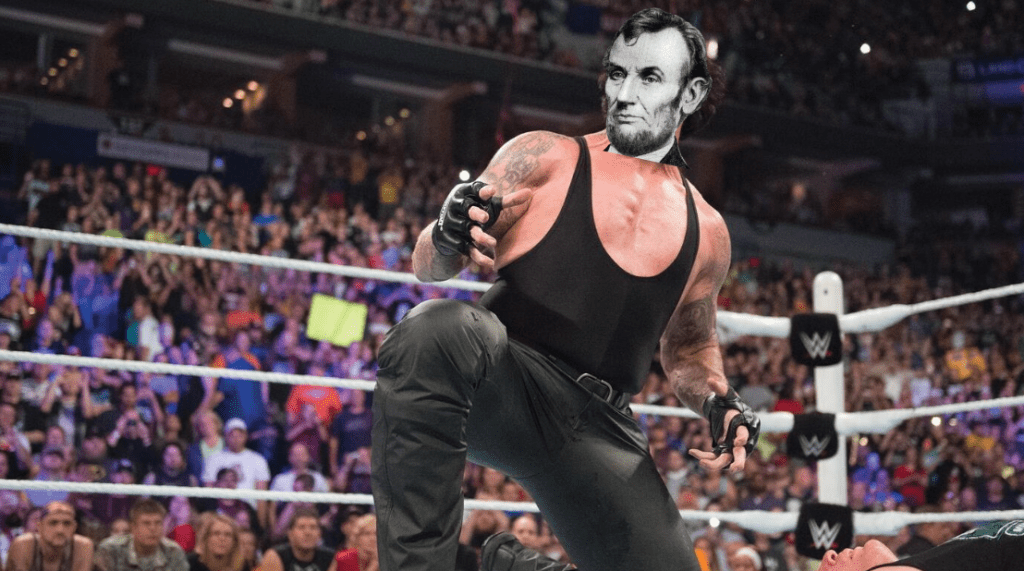 The buzzer sounds, and “Ain’t No Grave” by Johnny Cash plays on the loudspeakers. A tall figure in a tall hat emerges from the shadows, and the crowd goes wild as they realize it’s Abraham Lincoln. His long strides carry him slowly but menacingly down towards the ring. Lincoln tosses his hat into the crowd before stepping over the ropes. He stops to offer Carter a hand back to his feet, before turning around and coming face-to-face with Roosevelt. The crowd is at a fever pitch as arguably the two favorites to win the match size each other up. But, before either of them can move first, each are ambushed — Hayes comes out of nowhere to catch Lincoln off guard, while Truman launches a flurry of strikes against Roosevelt. Still, Lincoln is able to quickly recover and launch Hayes over the top ropes, while Roosevelt uses Truman’s momentum against him and sends him over the ropes as well.