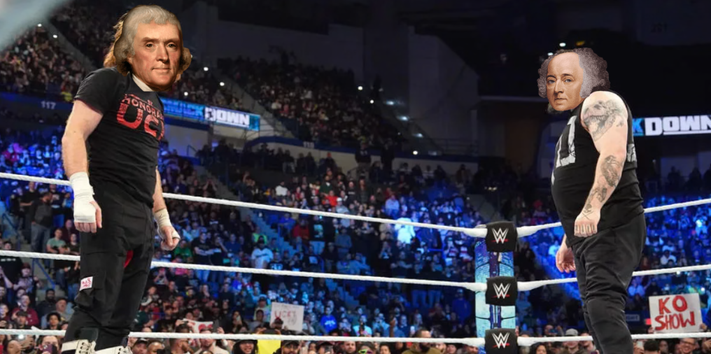 The buzzer sounds again, this time followed by the theme for John Adams. Of course, who enters the match is none other than John Adams himself, although he and the rest other Founding Fathers aren’t exactly thrilled to see each other. In fact, it’s Jefferson — the Sami Zayn to his Kevin Owens — that Adams is eyeing in particular. In the middle of the ring, the two former friends turned foes have an intense staredown as the crowd goes wild. The two then engage in a hockey fight, trading big shot after big shot as neither appears ready to give an inch. They both run the ropes and shoulder check each other to the mat, struggling to get back up afterwards.