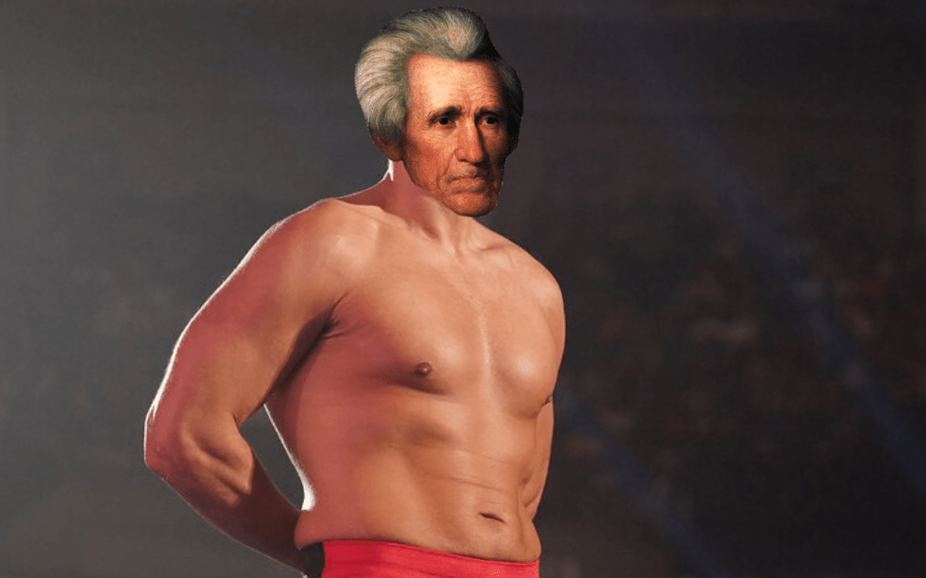 The chorus for “Ice Ice Baby” by Vanilla Ice starts to play, before giving way to “For the Love of Money” by the O’Jays — the theme of The Apprentice. At last, Donald J. Trump makes his entrance, getting the privilege of being the final competitor due to champion’s advantage. As Trump walks to the ring and breaks out his dance a couple of times (once in front of the wheelchair-bound Roosevelt), the audience greets him with a deafening chorus of boos, giving Trump a level of nuclear heat not achieved by even Roman Reigns post-Wrestlemania 33, Gunther after retiring John Cena, or Shawn Michaels in Montreal. As Trump reaches the ring, the rest of the presidents — who hadn’t resumed action since stopping for Roosevelt’s entrance — brace for him to enter. However, Trump just stands there, not technically needing to enter just yet. With no other competitors left, there’s no rush. Trump has decided to just bide his time and wait for the rest of the field to whittle themselves down. As the yelling continues, Jackson finally has enough and delivers a chop to Carter, causing a pissed off Lincoln to deliver a receipt at Jackson, which sparks the action in the ring once again.
