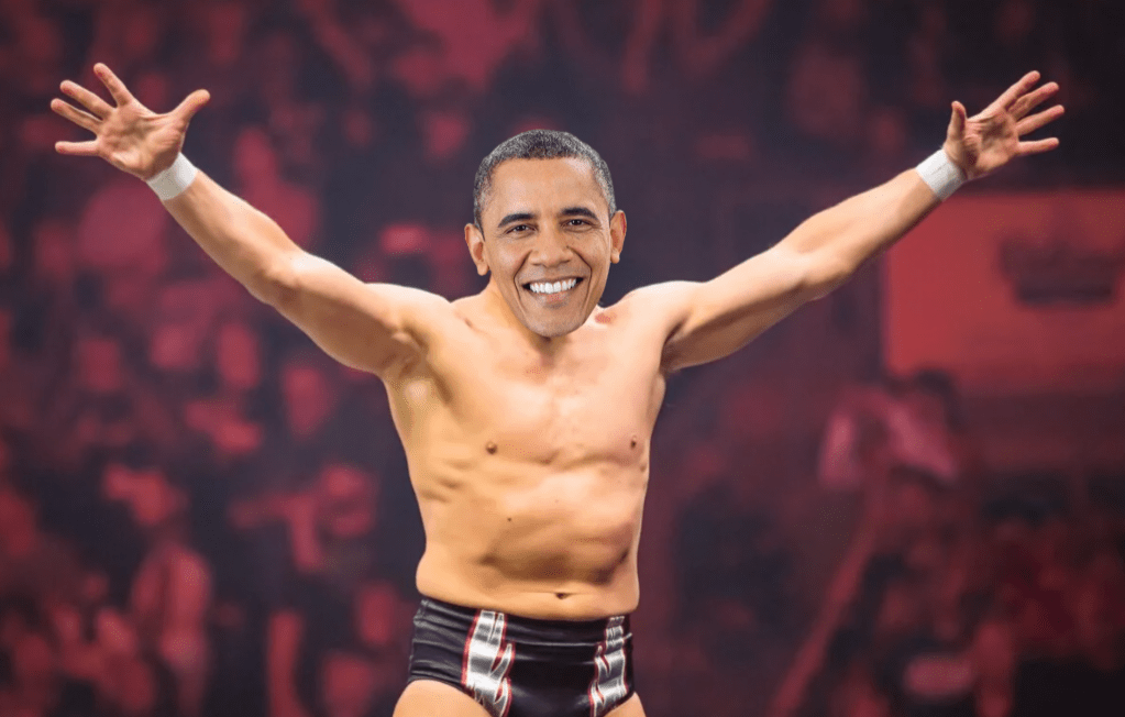 “Not Like Us” by Kendrick Lamar blares across the venue, causing the audience to lose their minds, knowing there’s only one president who can walk out to that song. Chants of “YES WE CAN!” break out, as Barack Obama makes his way to the ring. But upon stepping through the ropes, his smile disappears — not in favor of a look of fear, but rather one of determination. Seeing the presidents mainly responsible for the Great Depression and having to deal with the Great Recession himself, Obama decides to take out some frustrations on the trio in front of him. Harding and Hoover both go after Obama at once, but the latter gets out of the way before hitting both with a clothesline. As Harding and Hoover bounce back up, Obama proceeds to alternate between them as he kicks them in the chest, the crowd chanting “YES!” every time connects. Once both are stunned, Obama first sends Harding over the top rope, followed by Hoover. As Obama turns towards him, Coolidge backs up and attempts to run the ropes, only to be met by a Busaiku Knee from Obama. A stunned Coolidge is then picked up by Obama and tossed over the top rope to a chorus of cheers.