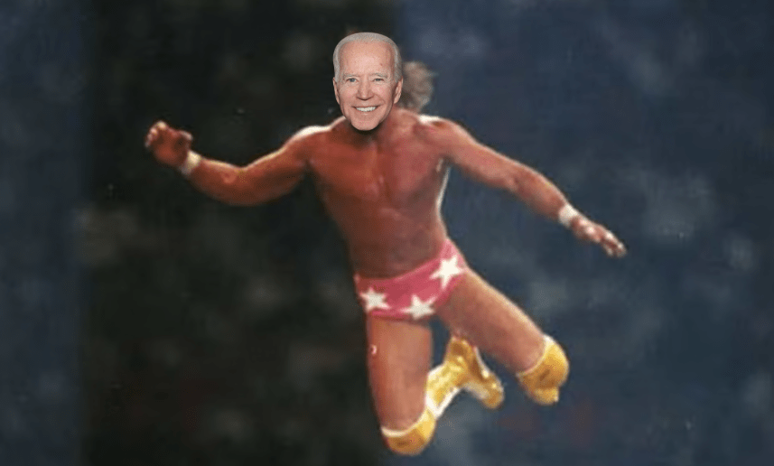 Enraged at his dance partner and fellow Mt. Rushmore mate being eliminated so sneakily, Lincoln walks across the ring and slides under the ropes. Roosevelt, having seen Washington’s elimination (something he tried and failed to do many times), breaks away from the pack and slides under the ropes as well. Lincoln and Roosevelt confront Trump, demanding he get in the ring and officially enter the match. Trump refuses, insisting that his way is the smartest way and telling his competitors to go back themselves. Lincoln and Roosevelt turn to leave, but double back and start pummeling Trump, much to the crowd’s delight. After both hit a series of chops and strikes, Lincoln and Roosevelt leave a dazed Trump sprawled out on the announcer’s table before they get back in the ring. Meanwhile, Biden, seeing a prone Trump lying on the table and wanting to join in on the fun, climbs up to the top rope and leaps into the air, hitting Trump with a flying elbow drop that smashes both of them through the table. After a few seconds, Biden gets to his feet and roars in triumph, only for the referee to inform him that due to this being a Royal Rumble-type match, Biden has just eliminated himself, much to Obama’s exasperation.